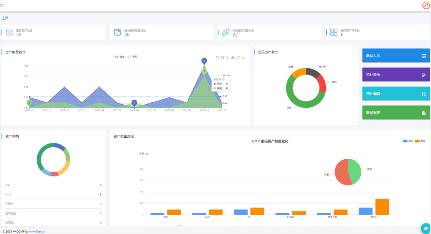 可按照全国、省、市、区县/单位、机房精度多级统计分析,给予包含资产总量、改造应用占比、资产运行情况、资产增长情况、资产容量情况、资产排行情况、厂商统计、证书发证统计、密钥使用统计、信创占比等维度统计分析。