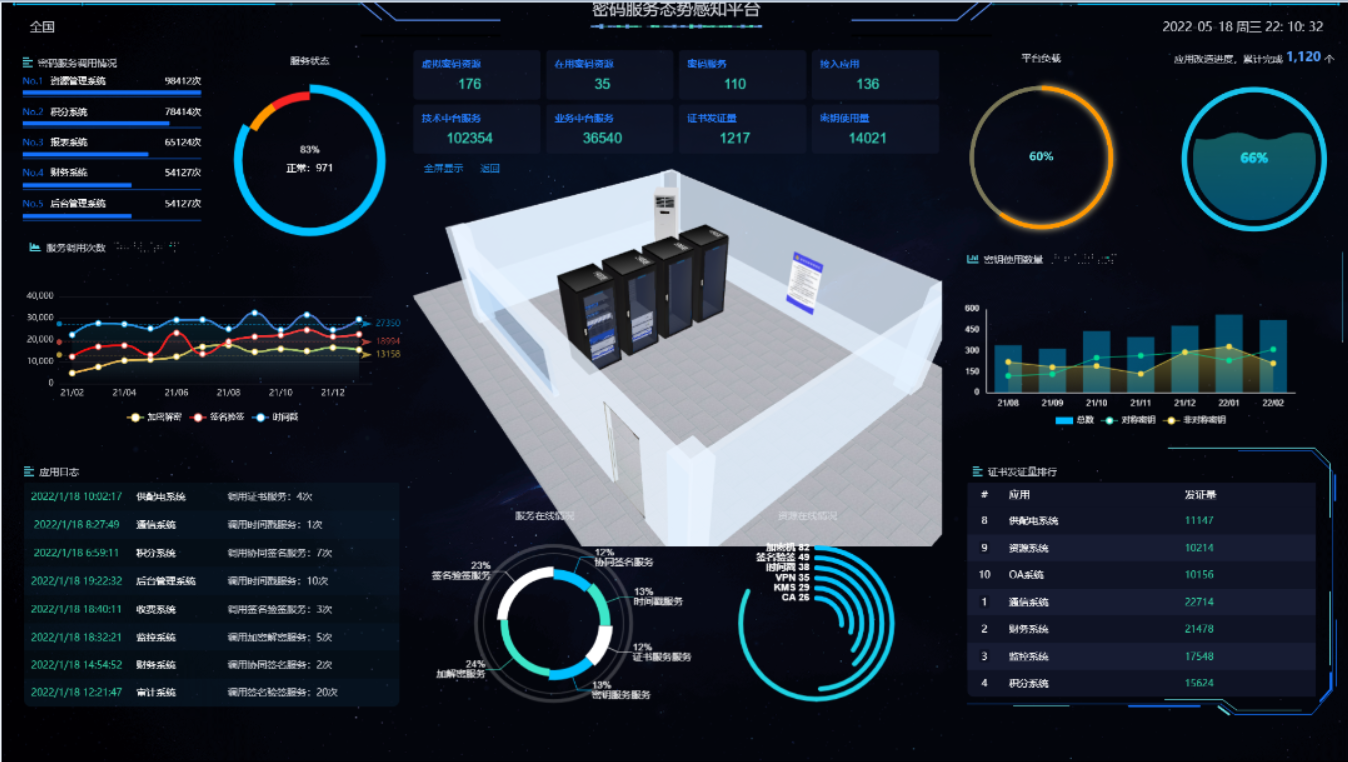 给予行业态势感知和设备运行态势感知内容呈现。行业态势感知包含资产概况、资产数排行、资产类型、各地区密码资产分布、各类资产改造应用等,设备运行态势感知包含设备总台数、资产在线比例、设备在线时长统计、设备分类信息统计、证书发放量、密钥使用量等统计。